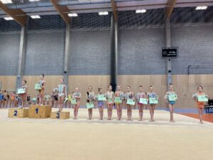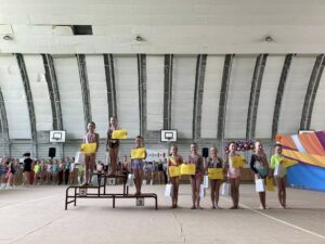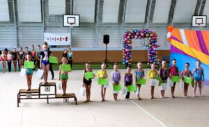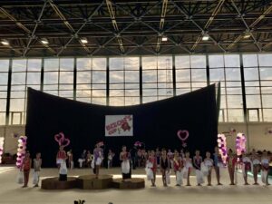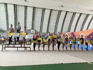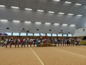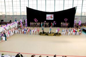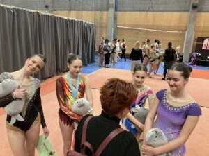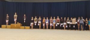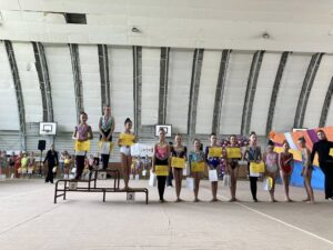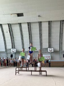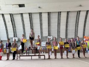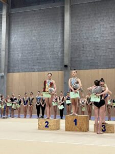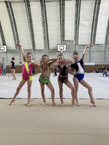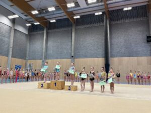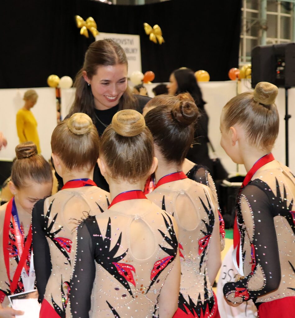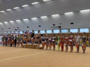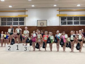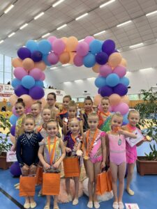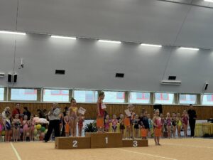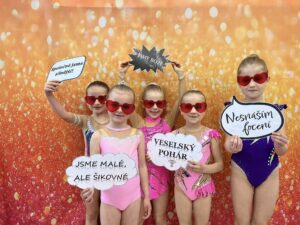 V neděli 12.dubna se závodnice základního i kombinovaného programu vydaly na Veselskou stuhu. Pro děvčátka narozená v roce 2021 to byl první závod v životě. Nejlépe si v sestavách bez náčiní a akrobatické vedla Mija Poláková, která získala stříbrnou medaili, na stupínky ji doprovodila bronzová Nina Očenášková, na bramborové pozici byla Eliška Pražáková. Gymnastky ročníku narození 2020 předvádí v základním programu stejné sestavy a zde ovládly Břeclavačky celé stupně vítězů. Na nejvyšší příčku vystoupila Aneta Bradáčová, stříbrná skončila Linda Janotová a bronz získala Alžběta Beránková. V kombinovaném programu si svou premiéru odbyla šestiletá Adéla Konečková. Svou volnou sestavou bez náčiní zvládla na výbornou a odvezla si z Veselí zlatou medaili. O rok starší gymnastky přidaly k bez náčiní povinné švihadlo. Zde vyhrála s velkým náskokem hlavně díky výbornému švihadlu Viktorie Hrnčířová, stříbrná byla Zuzana Bradáčová. V I. kategorii startovaly čtyři břeclavské závodnice. Vyzrálý a vyrovnaný výkon v obou sestavách podala Sofie Jungmannová a zaslouženě zvítězila, na třetí stupínek vystoupila Rozárka Rezová, těsně čtvrtá skončila Karolína Janotová, jedenáctá byla Štěpánka Kurková. Ve II. kategorii cvičily Veronika Bradáčová a Tina Radkovičová. Verunka získala za povinné bez náčiní nejvyšší známku, nevyvarovala se však chyb ve švihadle a po součtu obou známek vystoupila na výborný bronzový stupínek. Tince chyběla jistota a výraz v obou sestavách, přesto je čtvrté místo v početné konkurenci úspěchem. Ve III. kategorii předvádějí gymnastky povinnou obruč a volný míč. Michaela Frýdková předvedla v obou sestavách hezký výkon, a obsadila pěkné jedenácté místo. Johana Bušková zbytečně chybovala, což ji stálo cenné body a skončila dvacátá. Kamila Blinda ve IV. kategorii KP podala ve stuze i kuželích vyzrálý a výrazový výkon a odměnou jí byla sice nepopulární, ale výborná bramborová medaile, když od bronzu ji dělilo pouhých patnáct setin bodu.